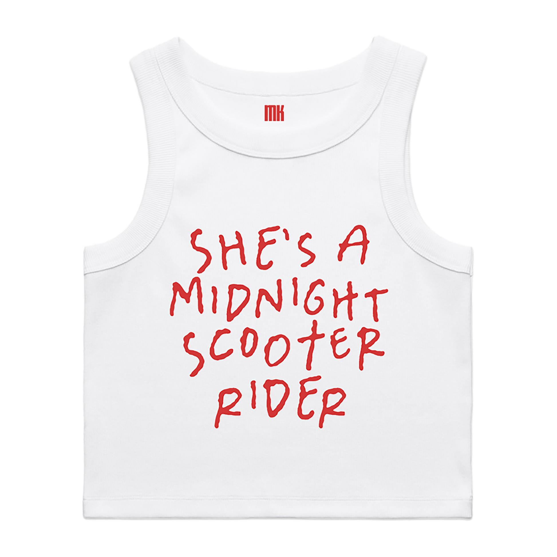 White cropped tank top with ribbed texture and 'She's a midnight scooter rider' lyric print.